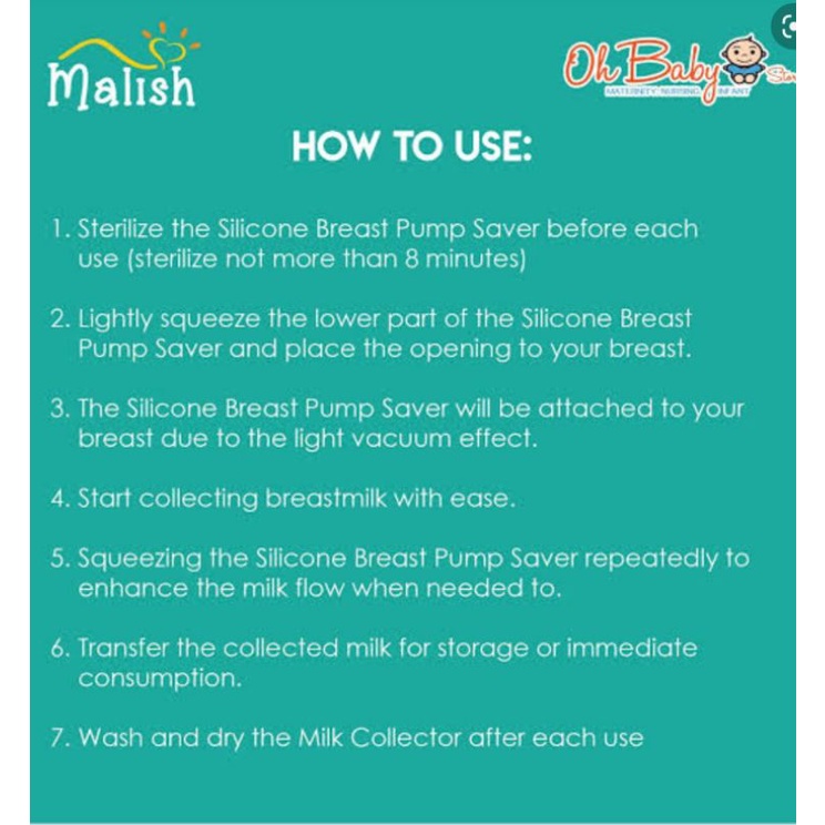 Spesifikasi: Nama Barang: Malish Milk Saver Silicone Breast Pump Merk: Malish Bahan: food Grade silicone (BPA Free) Kapasitas: 100 ml Max Temperature : 120 Celcius Size : 14.5 x 6.5 cm