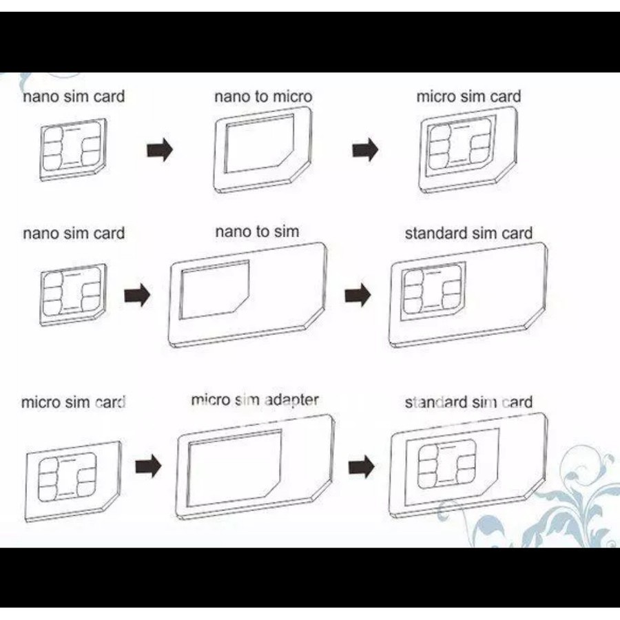 Sim card adapter untuk kartu sim yang sudah terlanjur dipotong. Tidak perlu mengurus ke operator selular untuk membuat kartu baru. Memudahkan kegiatan multimedia anda. tiap 1 paket terdiri dari: - nano ke micro sim - nano ke sim - micro ke sim - pin pembuka slot kartu sim.