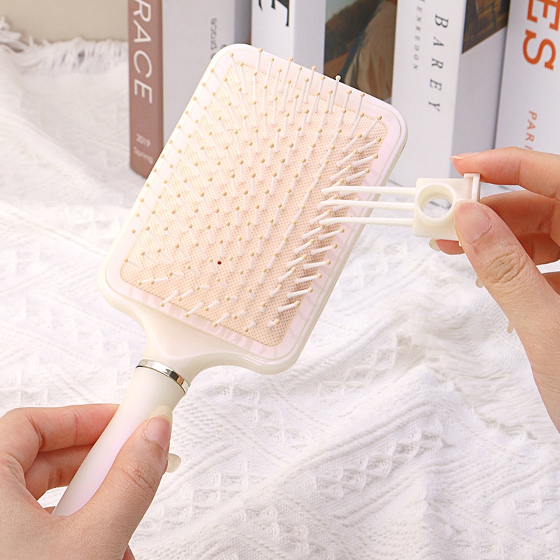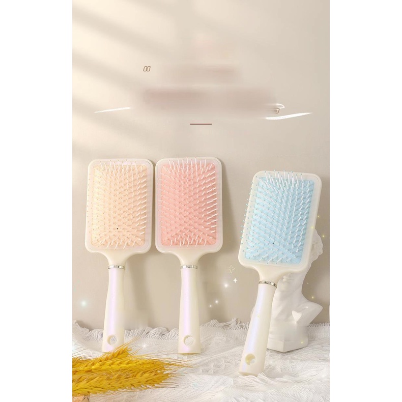 Merek: No Brand No. Item: sisir paddle brush Kategori produk: sisir paddle brush dengan bantalan udara yang lembut tiga variasi warna Warna: Cream, Pink, Biru Bahan: plastik Ukuran: lebih dari 20cm