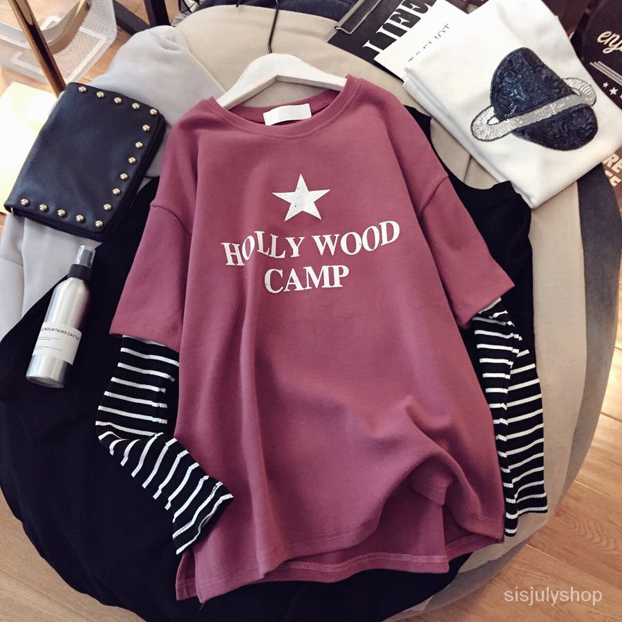 Detail #Sisjuly# Kemeja garis-garis kaos lengan panjang dua potong kain perca kaos wanita palsu