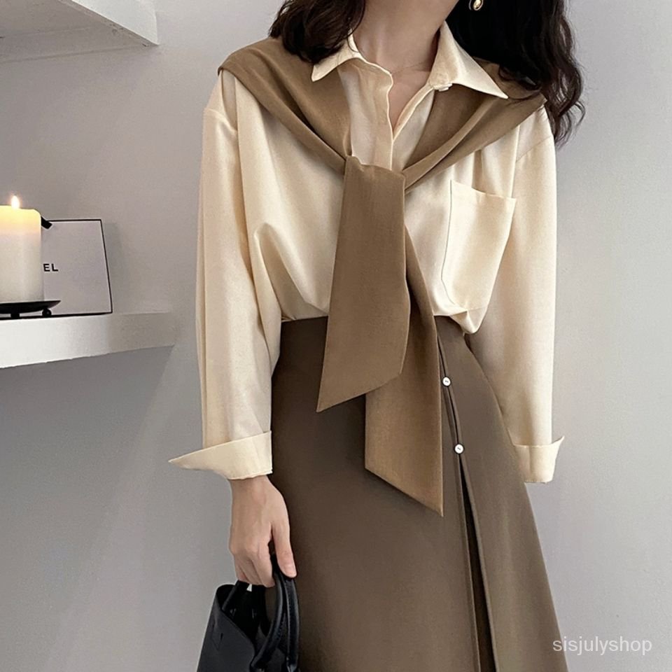 #Sisjuly# Selendang longgar wanita tambal sulam palsu dua potong kemeja kasual + desain pinggang tin