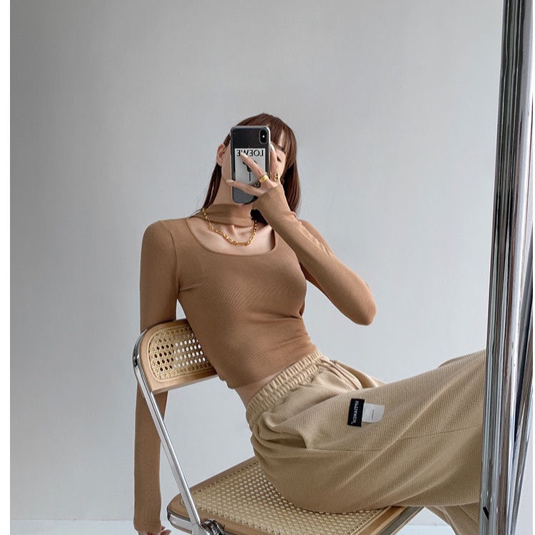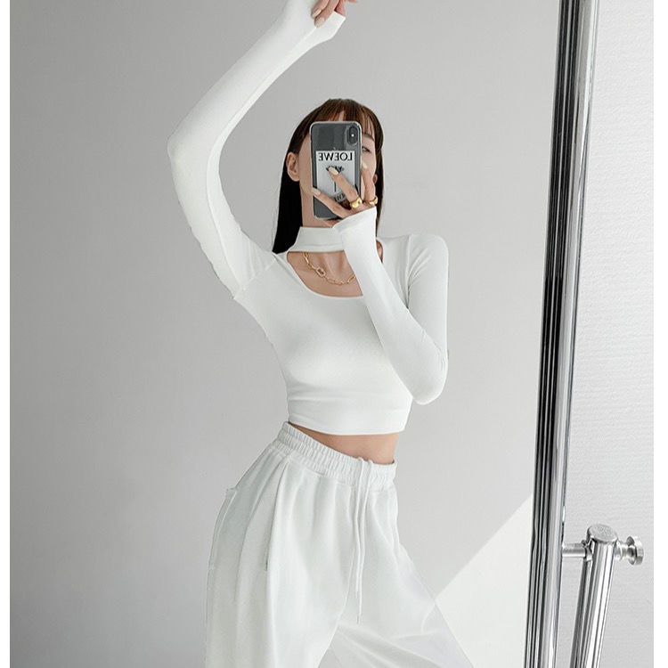 Detail #Sisjuly# Sexy ketat elastis hangat T-shirt menggantung leher melubangi klavikula logam bottoming kemeja wanit