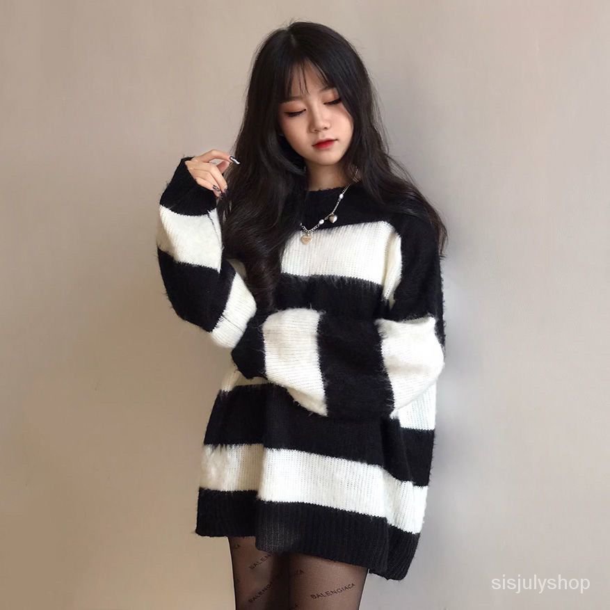 Detail #Sisjuly# Striped jumper wanita baru longgar dan tipis bagian menengah panjang lengan panjang atasan