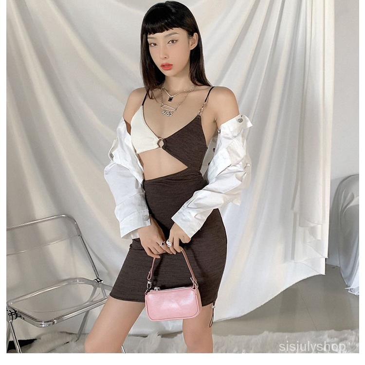 Detail #Sisjuly# Wanita Perancis Tidak Teratur Kontras Warna Halter Sling Rok Wanita Rok Pendek Ramping Ber