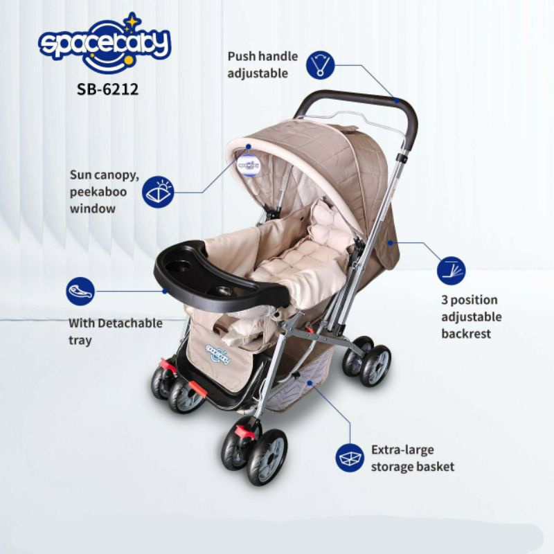 Perbedaan : SB 6212 : Dorongan 2 Arah, Dapat Alas empuk, Ada kantung dibagian kanopi SB 6211 : Dorongan 1 Arah, Roda 3, Dapat Cup Holder, Sabuk pengaman 5 titik SB 6215 : Dorongan 2 Arah, Kanopi Full, Sabuk pengaman 5 titik