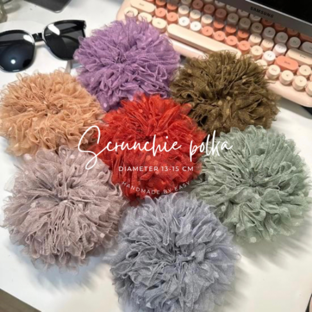 SCRUNCHIE TILE IKAT RAMBUT CEPOL HIJAB PENAMBAH VOLUME BAHAN TULE POLKADOT SCRUNCHIE TILE POLKA HANDMADE BY MAKEITEASY