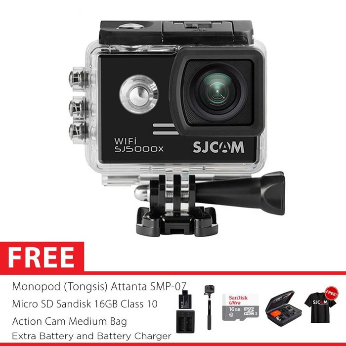 *GARANSI RESMI SJCAM 2 TAHUN *FREE T-SHIRT SJCAM ORIGINAL SJCAM SJ5000 X ELITE BLACK is a wonderful little camera built for versatility and packed with tons of cool features. A 2" screen allows you to view your footage immediately and with built-in stabilization and a wide angle lens you can now take better photos and smoother videos. With Wi-Fi you can capture more underwater footage via the SJCAM app viewed above with an iPad up to 10 meters. With all the mounts that come with this little camera you can start filming right away. Specification: Image Sensor: 12MP Sony IMX078 Sensor LCD2.0inch LCD Image Resolution : 2M (1920 x 1080), 1.3M (1280 x 960), 12M (4032 x 3024), VGA (640 x 480), 10M (3648 x 2736), 5M (2592 x 1944), 3M (2048 x 1536) Video Resolution : 4K (3840 x 2160)24fps, 2K(2560 x 1440)30fps, WVGA@240fps, 1080P (1920 x 1080) 60fps, 720P (1280 x 720)120fps Video/ Image Format: Video Format: MP4// Image Format: JPG Slow motion: -2x,-4x,-8x Lens: Adjustable between 170 140 110 and 70 Memory: Slot for Micro SD card up to 32GB Waterproof Rating : IP68 with waterproof case, 30m underwater Connection:USB 2.0 System Requirements: Windows 2000 / XP / Vista, Win 7, Mac OS x 10.3.6 above Batter life:80 minutes(1080P) Batter: Battery Detachable 900mAh Dimensions: 61x42.4x25mm Weight: 58g(without batter).74g with battery ISI PAKET : 1 x SJ5000X Action Cam 1 x Waterproof Housing 1 x Bicycle Stand 1 x Back Clip 1 x Housing Backdoor 1 x Micro USB Cable 1 x Switch Mount A 1 x Switch Mount B 1 x Switch Mount C 1 x Vertical Fixed Base 1 x Universal 1/4 Tripod Adapter 1 x Mount base 2 x Helmet Base 2 x Band 2 x 3M Adhesive Tape 1 x Cleaning Cloth 1 x Multi-language Manual 2 x SJCAM Stickers 1 x 900mAh Li-ion Battery 1 x Tongsis Attanta 1 x Micro SD Sandisk 16 GB Class 10 1 x Action Cam Medium Bag 1 x Extra Battery 1 x Extra Battery Charger Variasi yang ready : Black Blue White Pink Yellow Red Gold
