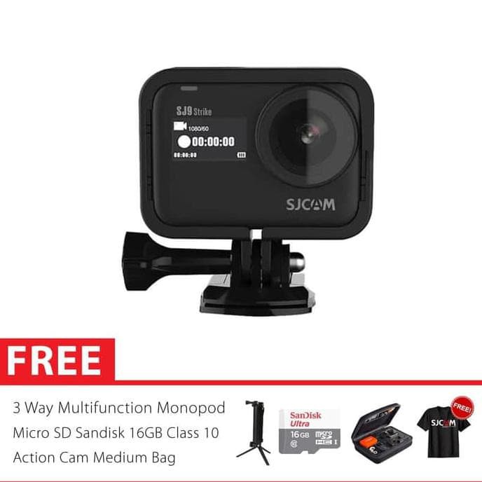 ISI PAKET : 1 x SJCAM SJ9 Strike 1 x Fixed Clip 1 x Tilting Clip 1 x Mounting Base 1 x Type-C Data Cable 1 x Cleaning Cloth 1 x Manual 1 x 3 Way Monopod 1 x Micro SD Sandisk 16 GB Class 10 1 x Action Cam Medium Bag
