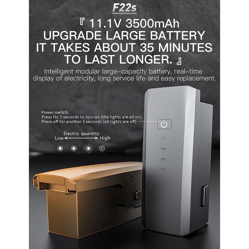 Description: Model:F22S 4K PRO/ F22 4K Operating Frequency: 2.4G + digital image transfer Bridge Drone Battery:11.1V 3500mAh Control Distance:3500m(Outdoor and unobstructed, depending on the environment and mobile device) Wifi Image Transmission Distance:3500m(Outdoor and unobstructed, depending on conditions and mobile device) Flight Time: About 30-35 min Charging Time: About 4.5 hours USB Charging: 5V/3A Product Size Unfolded:350X350X80MM , Folded:210X95X80MM Product Weight: 585 g F22 remote control battery:3.7V 1500mAh (soft pack lithium battery) F22S remote control battery:3.7V 3000mAh (cylindrical lithium battery) Remote control Charging Time: About 2 hours Remote control Operating Time: About 2 hours Camera: 2 -Axis Electronic Stabilization Gimbal Real 4K Camera Camera Lens : FOV:100° Photo resolution:3840* 2160P(phone) / 3840*2160P(SD card) Video resolution:1280*720P(phone) / 3840* 2160P(SD card)