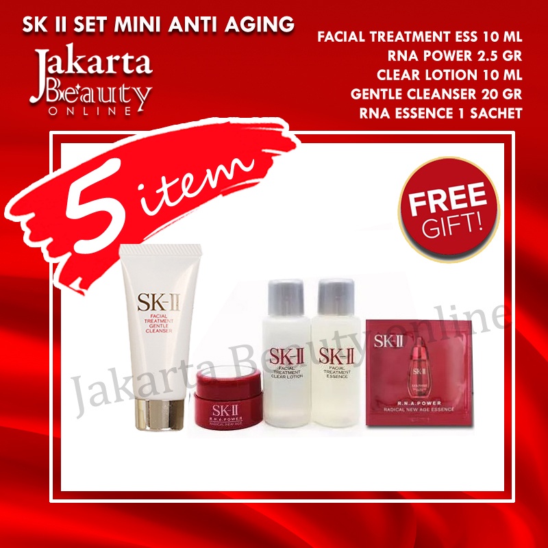 SK-II/ SKII/ SK II/sk2 paket pemula anti aging & eye cream mengatasi kerutan wajah dan kerutan di area mata hasil:wajah sehat halus,kencang dan kerutan memudar isi paket diatas 1. clear lotion 10 ml 2. FTE 10 ml 3. rna power cream 2.5 gram 4. rna eye cream 2.5 gr 5.gentle cleanser 20 gram Produk andalan SK-II yang dinobatkan sebagai yang terlaris dan banyak dicintai, Facial Treatment Essence memiliki lebih dari 90Pitera, bahan yang ditemukan lebih dari 30 tahun yang lalu namun masih tetap sama hingga hari ini.