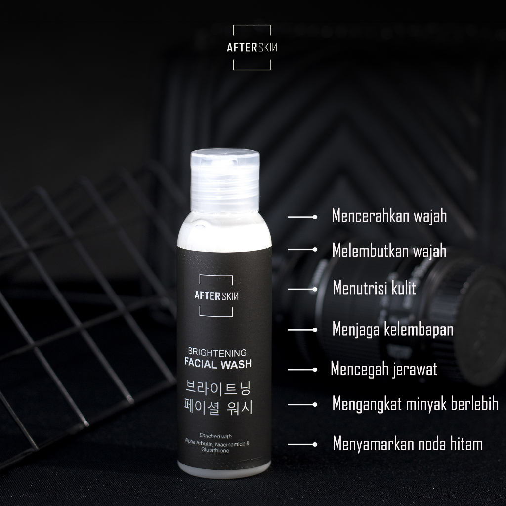 Afterskin Brightening Facial wash adalah sabun pencerah wajah pria dengan tekstur yang ringan bisa digunakan semua jenis kulit. Memililki kandungan Niacinamide, Alpha Arbutin, Glutathione yang dapat mencerahkan serta membuat kulit tampak glowing alami. Diperkaya dengan kandungan yang baik untuk menutrisi kulit serta menjaga kelembapan kulit sehingga kulit wajah menjadi lebih segar dan bercahaya. Mampu membersihkan wajah dengan baik untuk mencegah timbulnya jerawat. Hasil maksimal dengan pemakaian secara rutin.