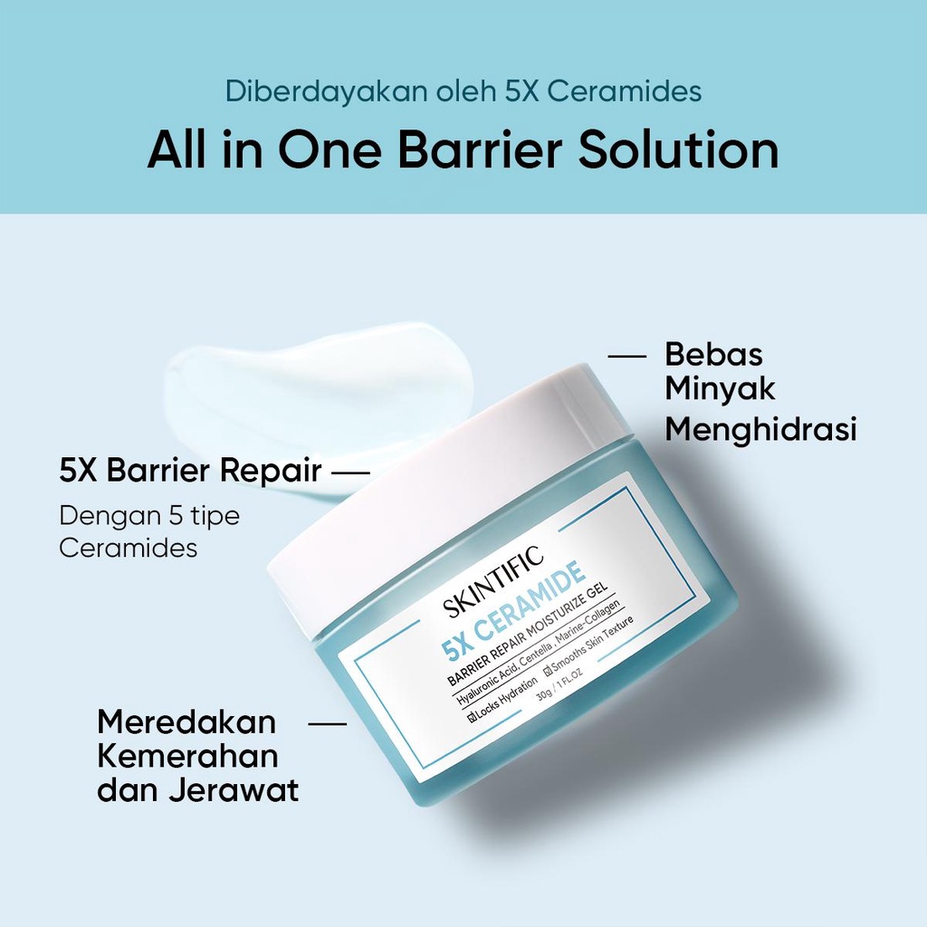SKINTIFIC 5X Ceramide Barrier Repair Moisture Gel Size:30g Hero Ingredients 5X Ceramide: Kombinasi 5 jenis Ceramide untuk mengembalikan dan menciptakan lapisan perlindungan kulit untuk mencegah hilangnya kelembaban Hyaluronic Acid: Menghidrasi kulit secara instan dan secara intensif memperbaiki sel kulit secara