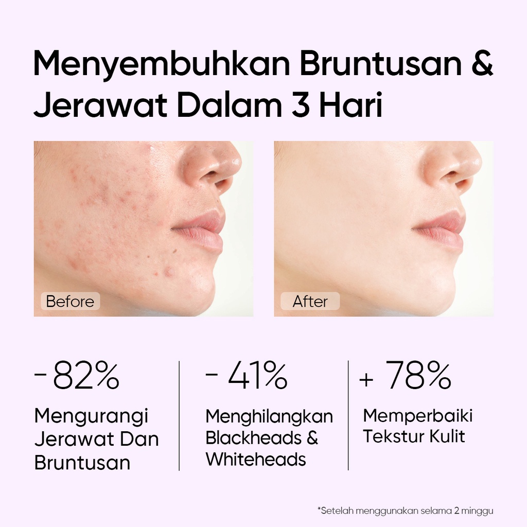 Manfaat ● Memperbaiki permasalahan skin barrier seperti jerawat, kemerahan, kulit kering, dan kulit bertekstur ● Melembabkan dan menghidrasi ● Oil control ● Melindungi skin barrier ● Memperkuat skin barrier ● Menenangkan dan melembutkan kulit