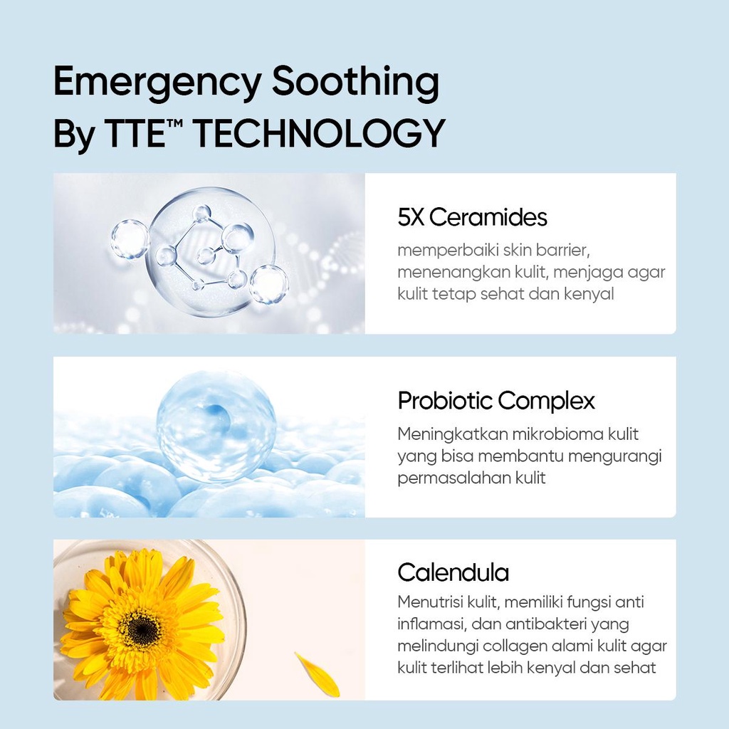 SKINTIFIC 5X Ceramide Soothing Toner 80ml Toner yang dapat digunakan sehari-hari untuk menenangkan kulit saat skin barrier sedang terganggu, membantu proses perbaikan skin barrier dan menjaga kulit agar tetap sehat. Memiliki kandungan 5 jenis Ceramide yang berbeda yang baik untuk menjaga barier kulit, ditambah kandungan probiotik kompleks yang dapat meningkatkan sel mikrobioma kulit untuk mengurangi permasalahan kulit, dan juga kandungan Calendula yang memiliki fungsi anti inflamasi, dan antibakteri sehingga bisa melindungi collagen alami kulit agar kulit terlihat lebih kenyal dan sehat Size: 80ml Toner yang bisa memberikan solusi instan untuk menenangkan kulit Memperbaiki skin barrier yang terganggu Mengurangi kemerahan, sensitif, dan membantu kulit berjerawat Menjaga kulit agar tetap terhidrasi dan terjauh dari permasalahan kulit Memperbaiki sel kulit agar lebih sehat dan kenyal Hero Ingredients: 5x Ceramide: Menggunakan 5 tipe ceramide untuk memperbaiki dan menenangkan barrier kulit Probiotik Kompleks: Meningkatkan mikrobioma kulit yang bisa membantu mengurangi permasalahan kulit Calendula: Menutrisi kulit, memiliki fungsi anti inflamasi, dan antibakteri yang melindungi collagen alami kulit agar kulit terlihat lebih kenyal dan sehat