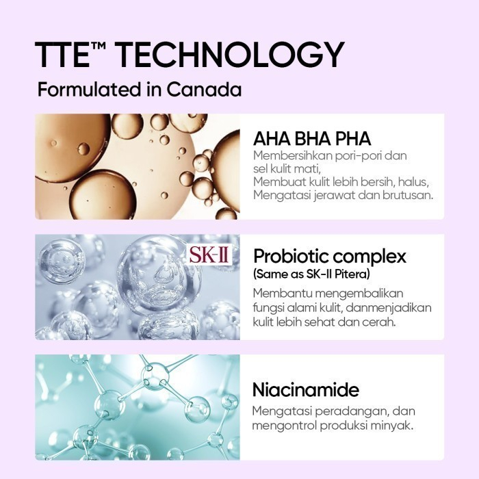 Perpaduan acid yang baik untuk kulit dan Kompleks Probiotik, bekerja sama untuk menghilangkan kotoran, sebum dan sel kulit mati, juga memperbaiki tekstur kulit kasar, dan kulit yang kusam. Kompleks Probiotik juga menyeimbangkan mikrobioma kulit, memperkuat barrier kulit, mengatasi dan mencegah jerawat & beruntusan untuk kulit yang tampak lebih glowing & cerah. Bahan ini juga digunakan oleh SKII Facial Treatment Essence dan disebut sebagai “PITERA” oleh SKII, terbukti secara ilmiah bahan yang efektif untuk membuat kulit lebih sehat dan kuat.