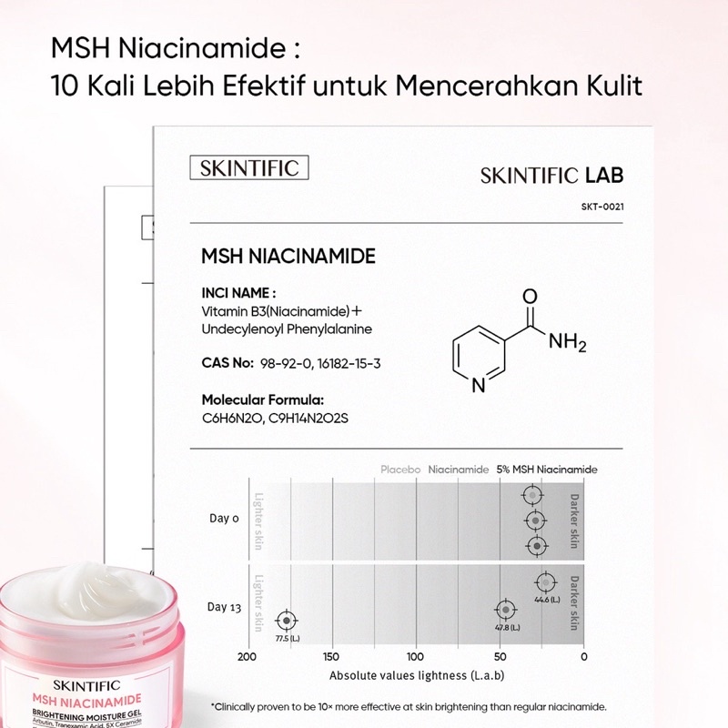 MSH Niacinamide Brightening Moisture Gel dengan tekstur seringan udara, dapat menyerap dengan cepat dan mengontrol minyak dalam 24 jam. Diformulasikan dengan Novel MSH Niacinamide ekslusif SKINTIFIC yang dikombinasikan dengan dua bahan pencerah yang ringan dan paling efektif yaitu Alpha Arbutin dan Tranexamic Acid, yang mampu mencerahkan dengan signifikan dalam waktu 14 hari. MSH Niacinamide terbukti secara klinis 10 kali lebih efektif dibandingkan niacinamide biasa dalam mengurangi hiperpigmentasi, meredakan kemerahan dan memperbaiki elastisitas kulit. Diperkaya dengan Centella Asiatica dan 5X Ceramide, tidak menyebabkan iritasi serta memberikan efek menenangkan kulit sekaligus memperbaiki dan menjaga skin barrier.