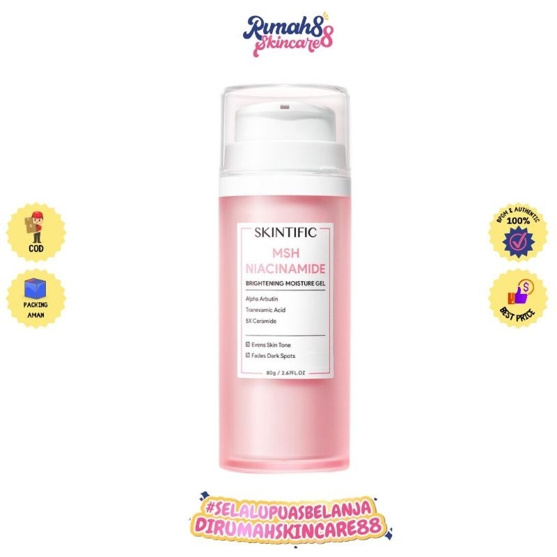 MSH Niacinamide Brightening Moisture Gel dengan tekstur seringan udara, dapat menyerap dengan cepat dan mengontrol minyak. Diformulasikan dengan Novel MSH Niacinamide ekslusif SKINTIFIC yang dikombinasikan dengan dua bahan pencerah yang ringan dan paling efektif yaitu Alpha Arbutin dan Tranexamic Acid, yang mampu mencerahkan dengan signifikan. MSH Niacinamide terbukti secara klinis 10 kali lebih efektif dibandingkan niacinamide biasa dalam mengurangi hiperpigmentasi, meredakan kemerahan dan memperbaiki elastisitas kulit. Diperkaya dengan Centella Asiatica dan 5X Ceramide, tidak menyebabkan iritasi serta memberikan efek menenangkan kulit sekaligus memperbaiki dan menjaga skin barrier.