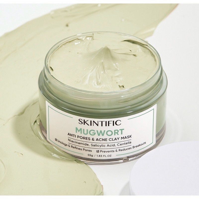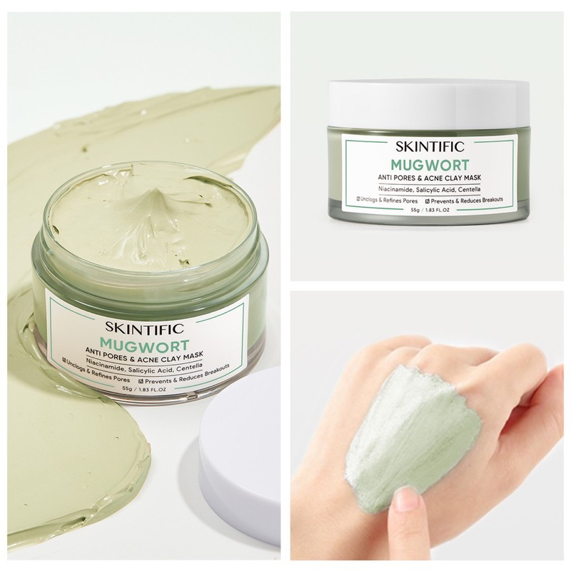 SKINTIFIC Mugwort Anti Pores & Acne Clay Mask mengandung ekstrak Mugwort dengan kualitas terbaik untuk melawan breakout agar kulit lebih cerah dan ceria.