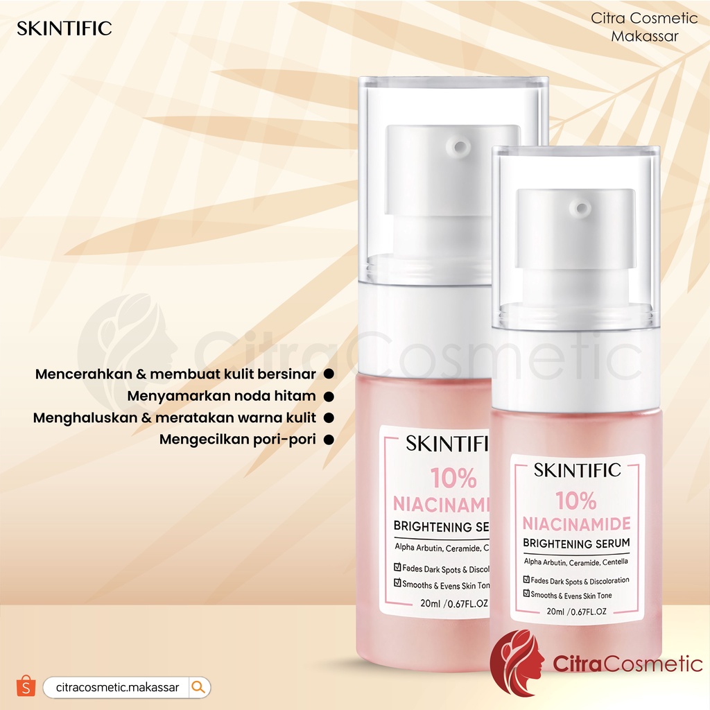 SKINTIFIC 10% niacinamide Brightening serum Serum pencerah yang mengandung 10% Niacinamide, yang sama dengan niacinamide pada SK-II, Arbutin, Ceramide, and Centella Asiatica. Dapat mencerahkan dengan cepat, menghilangkan bekas jerawat dan bekas terbakar sinar matahari dalam 7 hari. Niacinamide yang digunakan adalah Niacinamide paling terbaik di dunia, Royal DSM Niacinamide, yang dapat melindungi skin barrier dan mencerahkan secara mendalam.