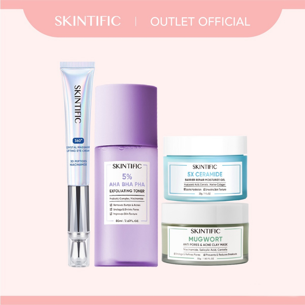 [FUNGSI] 1) Mengecilkan pori-pori 2) Membersihkan secara mendalam, mengurangi kemerahan 3) Membersihkan pori-pori, menghaluskan dan menyamaratakan warna kulit 4) Memperbaiki skin barrier, melembabkan dan oil control 5) Menenangkan Jerawat, menenangkan Bruntusan