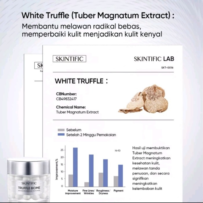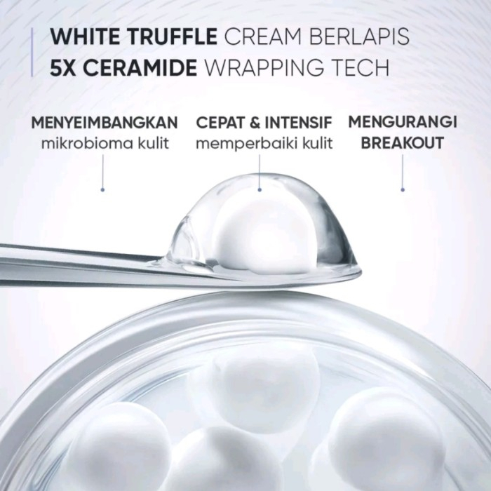 White Truffle ekstrak yang dikombinasikan dengan Probiotic Complex dalam bentuk pearl, dibalut dengan 5X Ceramide gel dengan Wrapping Tech Technology untuk menjaga mikrobiome kulit tetap sehat. Dengan tekstur yang unik, kombinasi tekstur gel dan cream, memberikan kelembaban lebih pada kulit, tanpa rasa lengket dan menghaluskan tekstur kulit. Cream Gel ini dengan cepat dan intensif dalam memperbaiki kulit dari kemerahan, kering dan iritasi sekaligus mengurangi breakout. Secara efektif menyeimbangkan mikroflora kulit untuk perbaikan kulit secara alami sekaligus menghidrasi dan melembabkan dan menjaga skin barrier. White Truffle sebagai jamur langka dengan kualitas tinggi dari Alba yang kaya akan asam lemak untuk mendukung skin barrier, Peptides sebagai anti-aging, serta Vitamin C untuk mendorong kulit bercahaya, melawan radikal bebas dan menjadikan kulit kenyal.