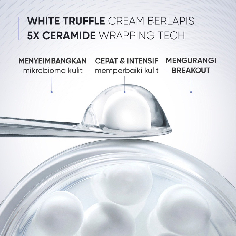 White Truffle ekstrak yang dikombinasikan dengan Probiotic Complex dalam bentuk pearl, dibalut dengan 5X Ceramide gel dengan Wrapping Tech Technology untuk menjaga mikrobiome kulit tetap sehat. Dengan tekstur yang unik, kombinasi tekstur gel dan cream, memberikan kelembaban lebih pada kulit, tanpa rasa lengket dan menghaluskan tekstur kulit. Cream Gel ini dengan cepat dan intensif dalam memperbaiki kulit dari kemerahan, kering dan iritasi sekaligus mengurangi breakout. Secara efektif menyeimbangkan mikroflora kulit untuk perbaikan kulit secara alami sekaligus menghidrasi dan melembabkan dan menjaga skin barrier. White Truffle sebagai jamur langka dengan kualitas tinggi dari Alba yang kaya akan asam lemak untuk mendukung skin barrier, Peptides sebagai anti-aging, serta Vitamin C untuk mendorong kulit bercahaya, melawan radikal bebas dan menjadikan kulit kenyal. Ukuran: 50 gr No BPOM: NA11220100272 Manfaat: ●Memperbaiki kulit secara mendalam ●Meredakan breakout dan tanda-tanda iritasi ●Menyeimbangkan mikroflora kulit ●Menjaga skin barrier dan menghaluskan kulit Hero Ingredients: White Truffle Extract : Mendukung, mengembalikan dan mendorong kulit bersinar dengan melawan radikal bebas, menjadikan kulit kenyal 5X Ceramide : Mengembalikan perlindungan barrier alami kulit untuk mencegah kulit kehilangan kelembabannya Probiotic Complex : Memelihara dan menghidrasi kulit secara efektif, meningkatkan fungsi skin barrier, serta menciptakan pelindung alami kulit yang mempercepat pembaruan kulit dan meningkatkan kesehatan kulit dengan melengkapi microbioma kulit Cara pemakaian: Ambil bagian bulatan menggunakan spatula, sebanyak 1 bulatan setiap penggunaan. Ratakan pada telapak tangan lalu aplikasikan ke seluruh wajah dengan merata.