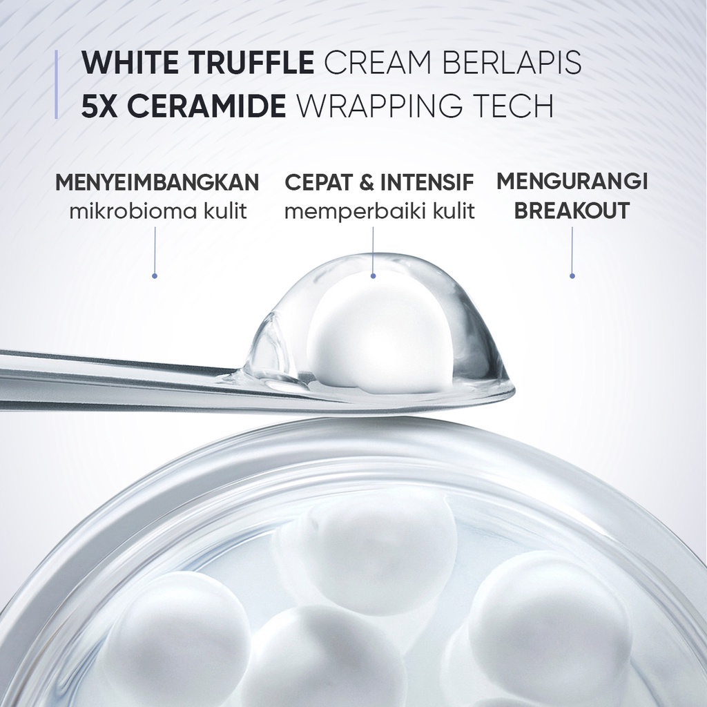 Hero Ingredients: White Truffle Extract : Mendukung, mengembalikan dan mendorong kulit bersinar dengan melawan radikal bebas, menjadikan kulit kenyal 5X Ceramide : Mengembalikan perlindungan barrier alami kulit untuk mencegah kulit kehilangan kelembabannya Probiotic Complex : Memelihara dan menghidrasi kulit secara efektif, meningkatkan fungsi skin barrier, serta menciptakan pelindung alami kulit yang mempercepat pembaruan kulit dan meningkatkan kesehatan kulit dengan melengkapi microbioma kulit