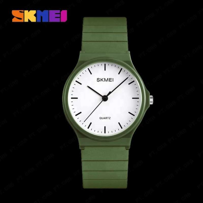 Brand : SKMEI Grade : Original. Tahan air : 3 ATM. Diameter case : 38mm. Tebal case: 8 mm Bahan case : ABS Panjang tali : 26.5 cm. Lebar tali : 18mm. Bahan tali : Rubber Tipe clasp : Pin Buckle. Display : Analog Mesin : Japan Movement Power Source : Battery