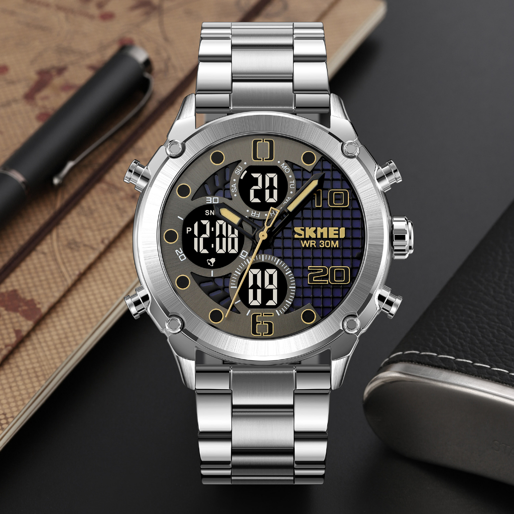 Brand : SKMEI Grade : Original. Tahan air : 3 ATM. Diameter case : 45.9mm. Tebal case: 14,4 mm Bahan case : Zinc Alloy Panjang tali : 26cm. Lebar tali : 22mm. Bahan tali : Stainless Steel Tipe clasp : Folding Clasp Display : Digital Analog Mesin : Japan Movement. Fungsi : 3time, Chrono, Alarm, Date, Week, EL, Count Down, 12/24hours