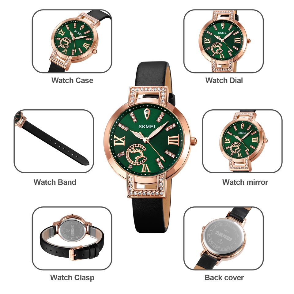 Brand : SKMEI Model : 1977 Gender : Wanita Diameter Case : 34.5mm Tebal Case: 9mm Bahan Case : Zinc Alloy Panjang Tali : 23cm Lebar Tali : 12mm Bahan Tali : PU Leather Tipe Buckle : Pin Buckle Display : Analog Mesin : Japan Movement Water Resistant : 3ATM Fitur : Jam, Menit, Detik.