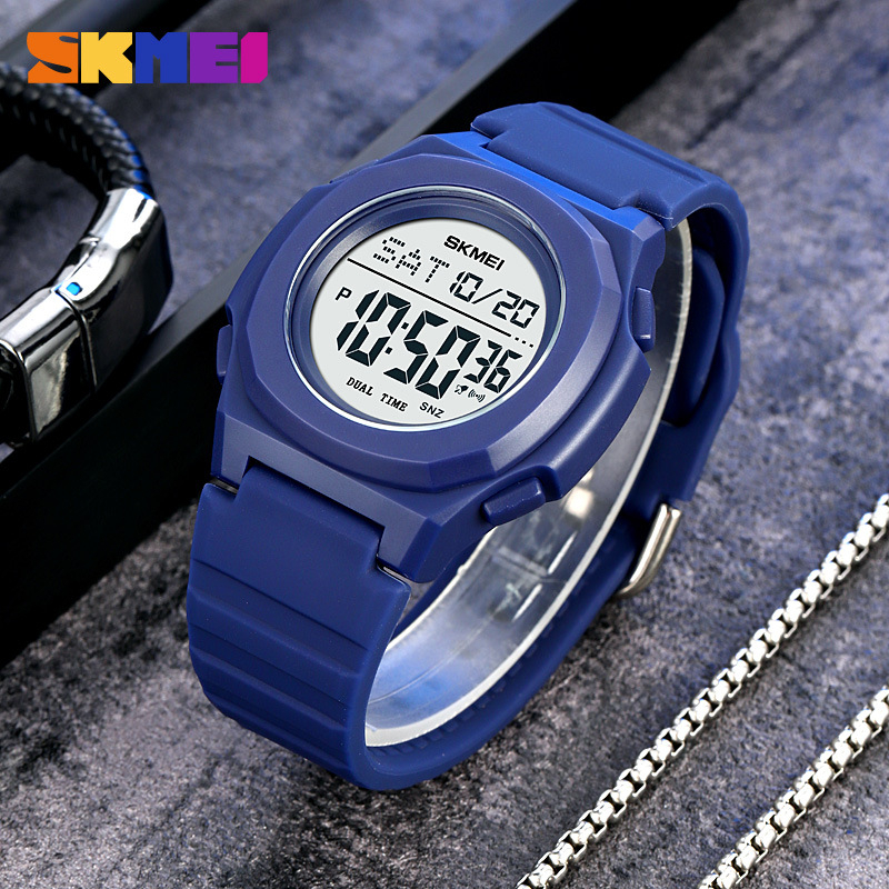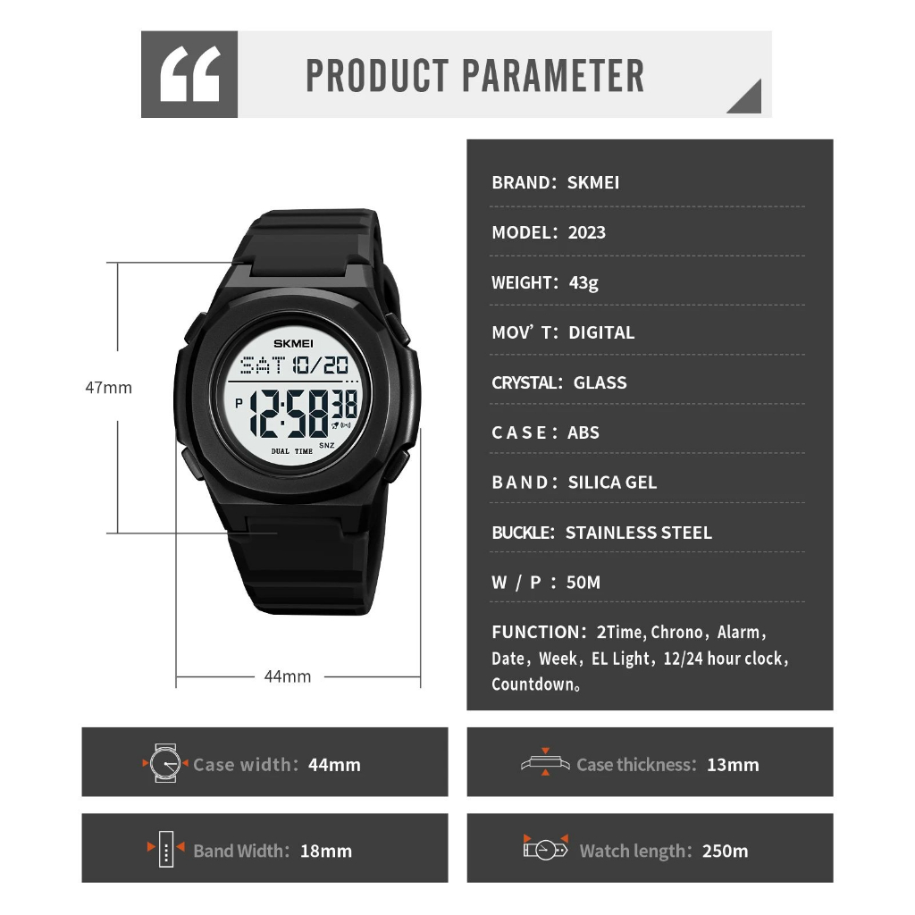 Brand : SKMEI Model : 2023 Gender : Pria/ Wanita Diameter Case :4,7 cm Tebal Casing : 1,3cm Lebar Tali : 1,8cm Panjang Tali : 25,0mm Bahan Casing : ABS Bahan Tali : Silica Gel Jenis Clasp : Pin Buckle Water Resistant : 5ATM Display : Digital Fitur : 2Time, Chrono, Alarm, Date, Week, LED Light, Count Down, 12/24 Hours Clock