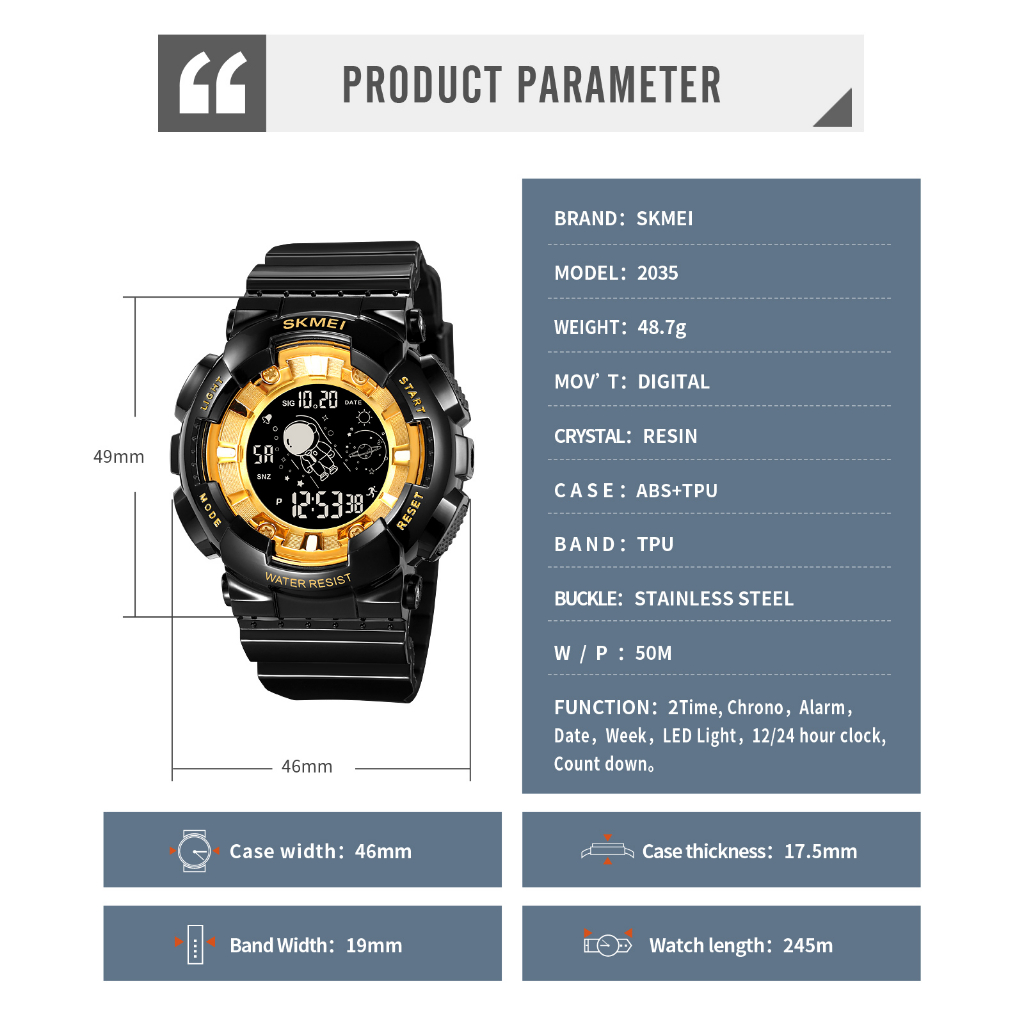 Brand : SKMEI Model : 2035 Gender : Pria/ Wanita Diameter Case :4,6 cm Tebal Casing : 1,7cm Lebar Tali : 1,9cm Panjang Tali : 24,5mm Bahan Casing : ABS+TPU Bahan Tali : TPU Jenis Clasp : Pin Buckle Water Resistant : 5ATM Display : Digital Fitur : 2Time, Chrono, Alarm, Date, Week, LED Light, Count Down, 12/24 Hours Clock
