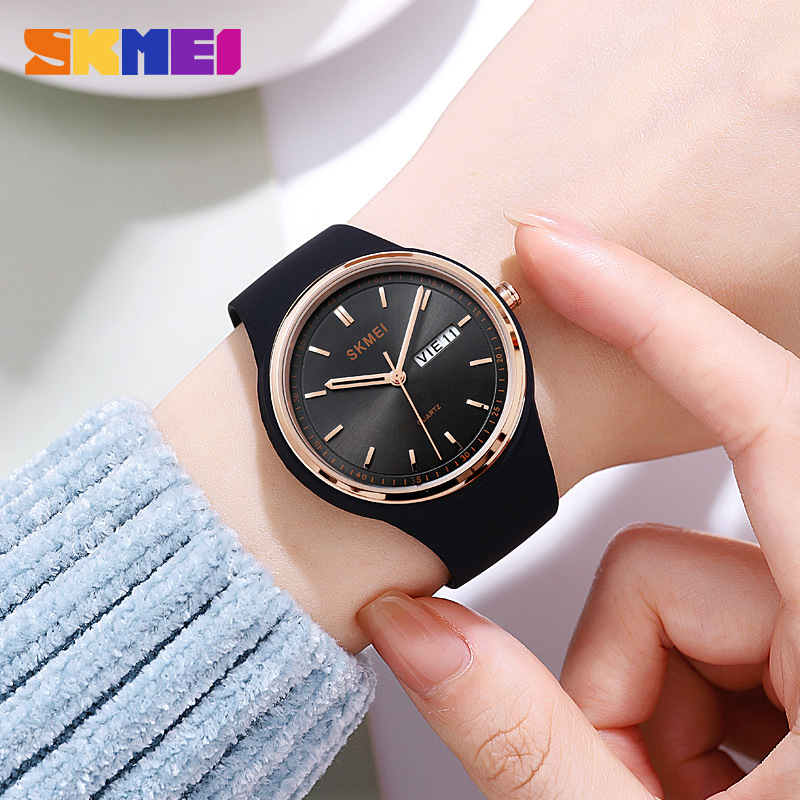 Brand : SKMEI Model : 2057 Gender : Wanita Diameter Case : 36.5mm Tebal Casing : 10.2mm Panjang Tali : 23,0cm Lebar Tali : 18mm Bahan Casing : ABS + Stainless Steel Bahan Tali : Silica Gel Buckle : Pin Buckle Mesin : Japan Movement Display : Analog Movement : Quartz Water Resistant : 3ATM Fitur : Jam, Menit, Detik, Tanggal, Hari