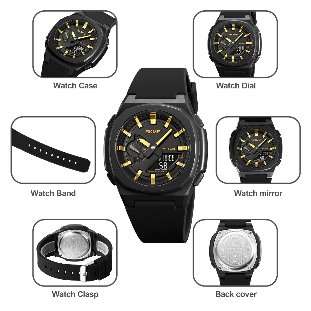 Brand : SKMEI Model : 2091 Gender : Pria/Wanita Diameter Case : 4,5 cm Tebal Casing : 1,4 cm Lebar Tali : 1,8cm Panjang Tali : 25,5mm Bahan Casing : ABS Bahan Tali : Silica Gel Jenis Clasp : Pin Buckle Water Resistant : 5ATM Display : Digital Analog Fitur : World Time, Chrono, 5 Alarm, Date, Week, LED Light, Count Down, 12/24 Hours Clock