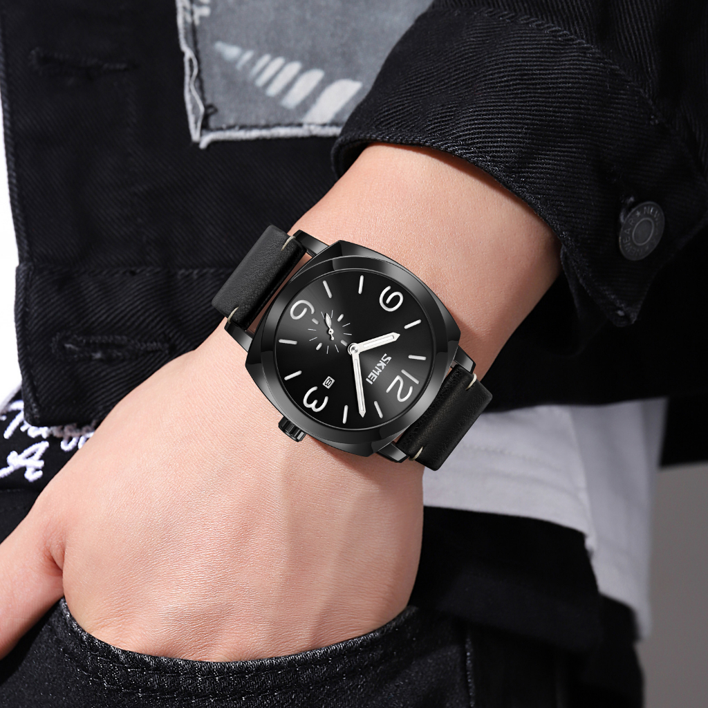 Brand : SKMEI Grade : Original. Tahan air : 3 ATM. Diameter case : 54mm. Tebal case: 14 mm Bahan case : Alloy Panjang tali : 26.5 cm. Lebar tali : 22mm. Bahan tali : Leather Tipe clasp : Pin Buckle. Display : Analog Mesin : Japan Movement. Kalendar : Tanggal Fungsi : Jam, Menit, Detik , Tanggal