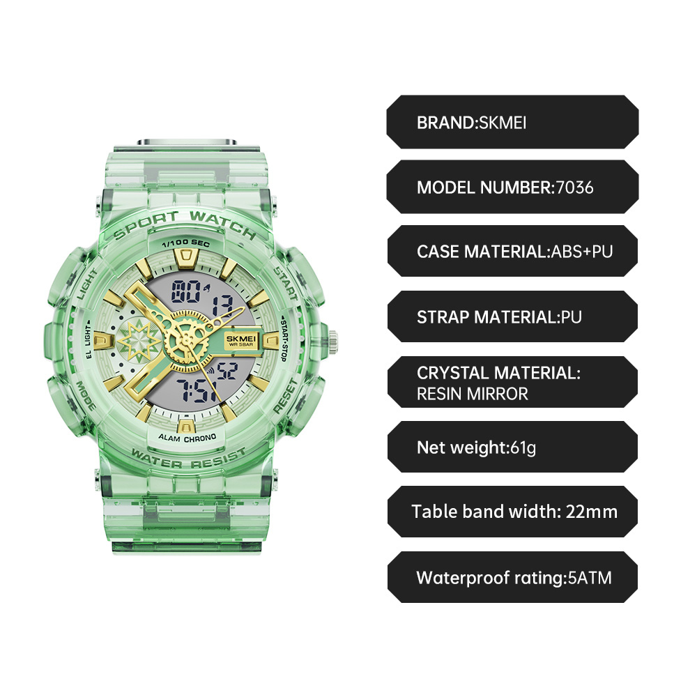 ❤️Parameter Jam Tangan Pintar: merek: SKMEI Model: 7036 Gerakan: kuarsa + gerakan elektronik Bahan cermin: cermin resin Kasus ABS + PU Tali jam tangan: PU Gesper meja: baja tahan karat Tahan air: Tahan air 50m Lebar dial: 51mm Ketebalan dial: 20mm Lebar pita: 22mm