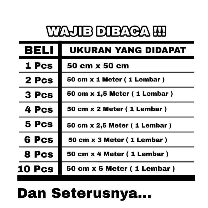 -Beli 1 pcs = 50 cm x 50 cm -Beli 2 pcs = 50 cm x 1 meter ( 1 lembar ) -Beli 3 pcs = 50 cm x 1,5 meter ( 1 lembar ) -Beli 4 pcs = 50 cm x 2 meter ( 1 lembar ) -Beli 10 pcs = 50 cm x 5 meter ( 1 lembar ) -DAN SETERUSNYA.....