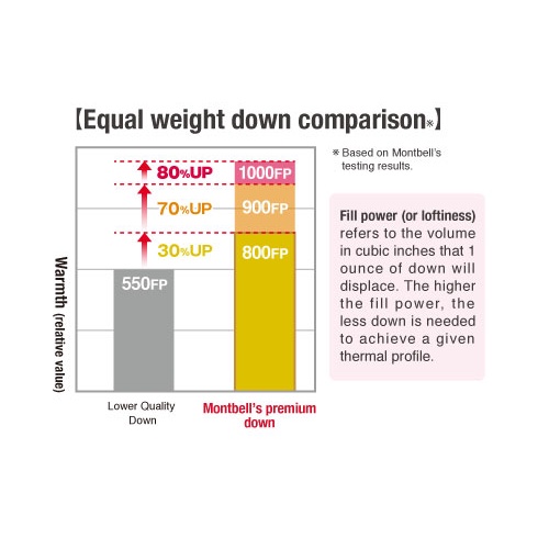 World class, high quality down Montbell's premium down comes from water fowl that live in regions with seasonal temperature extremes. The down balls from birds in such regions are characteristically much larger. Large down balls hold more warm air, which translates to needing less down to provide exceptional warmth retention.