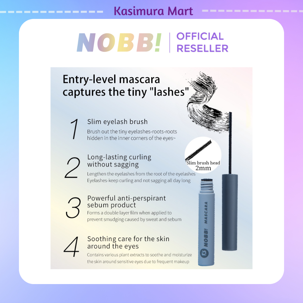 Brand: NOBB Dapat digunakan dari umur 15 tahun keatas. Instruksi penyimpanan: Harap disimpan di tempat yang kering dan sejuk, serta hindari terpapar sinar matahari langsung. Made in China Specification: 4.5g quantity: 1 Package content: 1 X Slender Mascara (with box)
