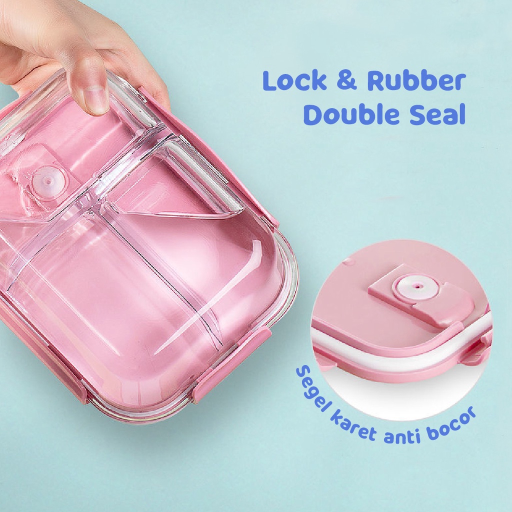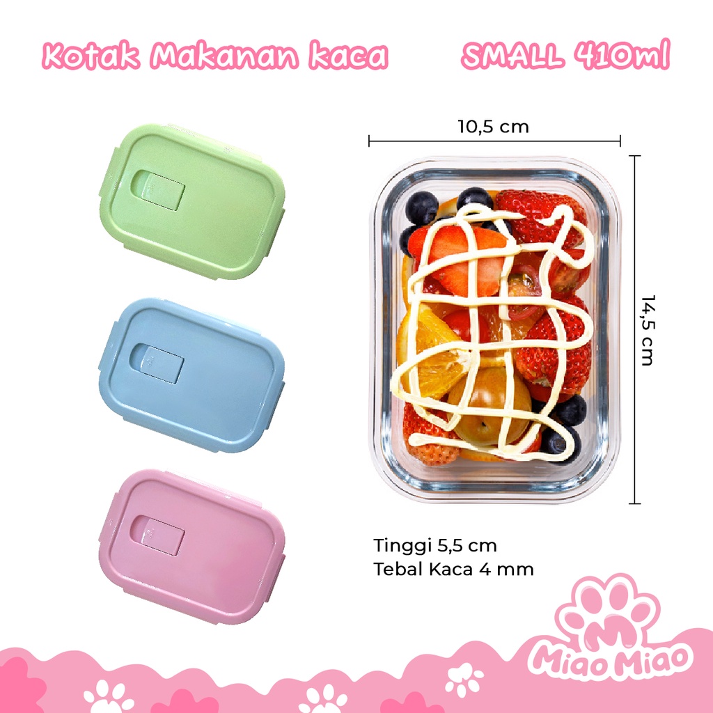 VARIAN SMALL 410ml BERAT BERSIH: 325gr - Bahan kaca tebal dapat dipanaskan di microwave & oven (Tahan panas hingga 200ºC ) - Dapat disimpan dalam kulkas dan freezer (Tahan dingin hingga -20ºC) - Segel ganda lock dan silikon menutup dengan erat anti bocor dan kedap udara. - Desain unik dengan 3 pilihan warna (BIRU, HIJAU, PINK). - Tersedia juga varian 2 kolom dan 3 kolom (Ukuran Large 1040ml). - Bahan kotak kaca dan tutup plastik PP berkualitas FOODGRADE (Aman untuk makanan). - Lobang udara pada tutup fungsi mempermudah buka tutup.