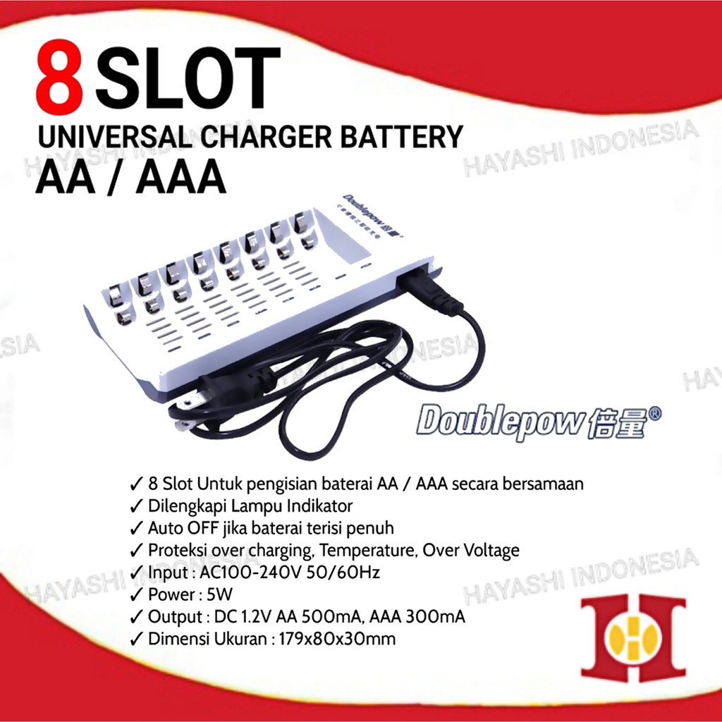 - DOUBLEPOW : Input : AC 100-240V 50/60Hz Power : 5W Output : DC 12V AA 500mA AAA 300mA 8 Slot untuk pengisian baterai AA/AAA secara bersamaan Dilengkapi Lampu Indikator Auto OFF jika baterai sudah penuh Proteksi Over Voltage, Over Charging, Over Temperature, Dll.. Dimensi Ukuran : 179x80x30mm