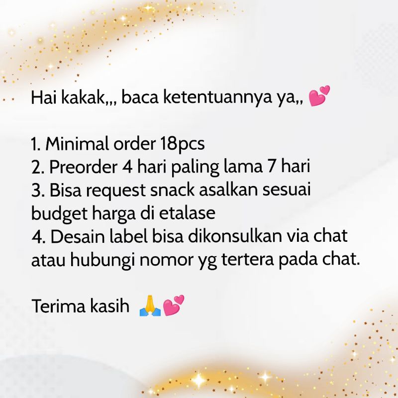 > Sudah termasuk free nama / label , dibungkus rapi seperti foto > Bebas pilih karakter / tema untuk desain label (label bagian atas) > Bisa untuk acara lain selain ultah (untuk desain label bisa kontak admin kami) > Masa kadaluwarsa snack terjamin (tidak dalam waktu dekat) > Jika ada snack yang kosong, akan diganti dengan snack sejenis (harga sama dan merek terpercaya). > semua paket bingkisan kami packing menggunakan dus (silahkan tambakan packing dus di Etalase)