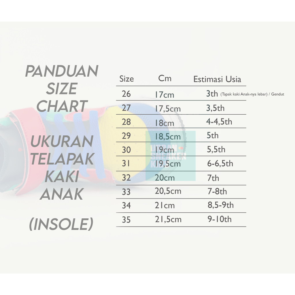 26 : (inner sole 17cm ; estimasi usia 3th) - kaki anak agak gendut 27 : (inner sole 17,5cm ; estimasi usia 3,5th) 28 : (inner sole 18cm ; estimasi usia 4-4,5th) 29 : (inner sole 18,5cm ; estimasi usia 5th) 30 : (inner sole 19cm ; estimasi usia 5-5th) 31 : (inner sole 19,5cm ; estimasi usia 6-6,5th) 32 : (inner sole 20cm ; estimasi usia 7th) 33 : (inner sole 20,5cm ; estimasi usia 7-8th) 34 : (inner sole 21cm ; estimasi usia 8,5-9th) 35 : (inner sole 21,5cm ; estimasi usia 9-10th) 36 : (inner sole 22cm ; estimasi usia 11th) 37 : (inner sole 23cm ; estimasi usia 13th)