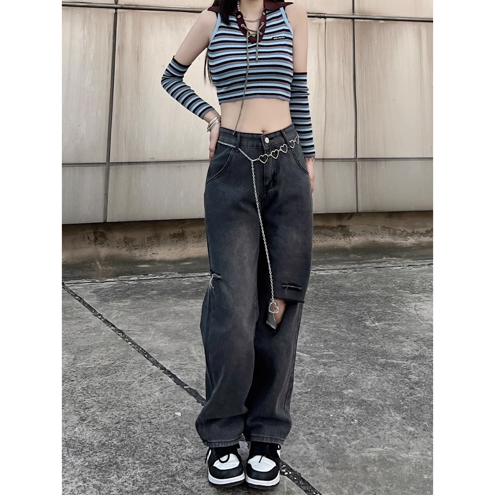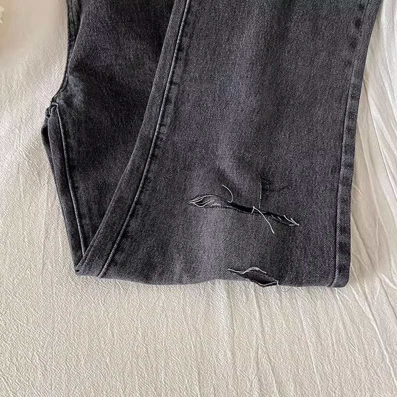 Detail Sobek Jeans Highwaist Loose Celana Jeans Wanita Kelabu Hitam(realpict)