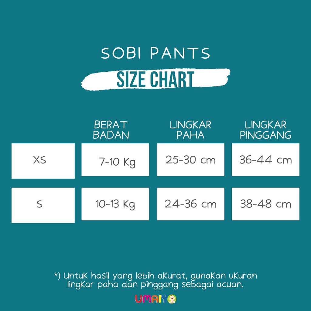 Memperkenalkan the new SOBI PANTS, clodi pants all in one super slim untuk dia yang aktif. Spesifikasi: π³ Outer: PUL π³ Insert: bamboo 5 layer terjahit menyatu, booster insert 5 layer bamboo (total 10 layer bamboo jika diguankan bersamaan) π³ Dengan snap di kanan dan kiri π³ Tersedia dalam 2 ukuran, XS untuk BB 7 - 10 kg, S untuk BB 10 - 13 kg (perkiraan) π³ Detil ukuran π³π³Lingkar paha: XS (25-30 cm) S (24 - 36 cm) π³π³ Lingkar pinggang: XS (36-44 cm) S (38 - 48 cm)