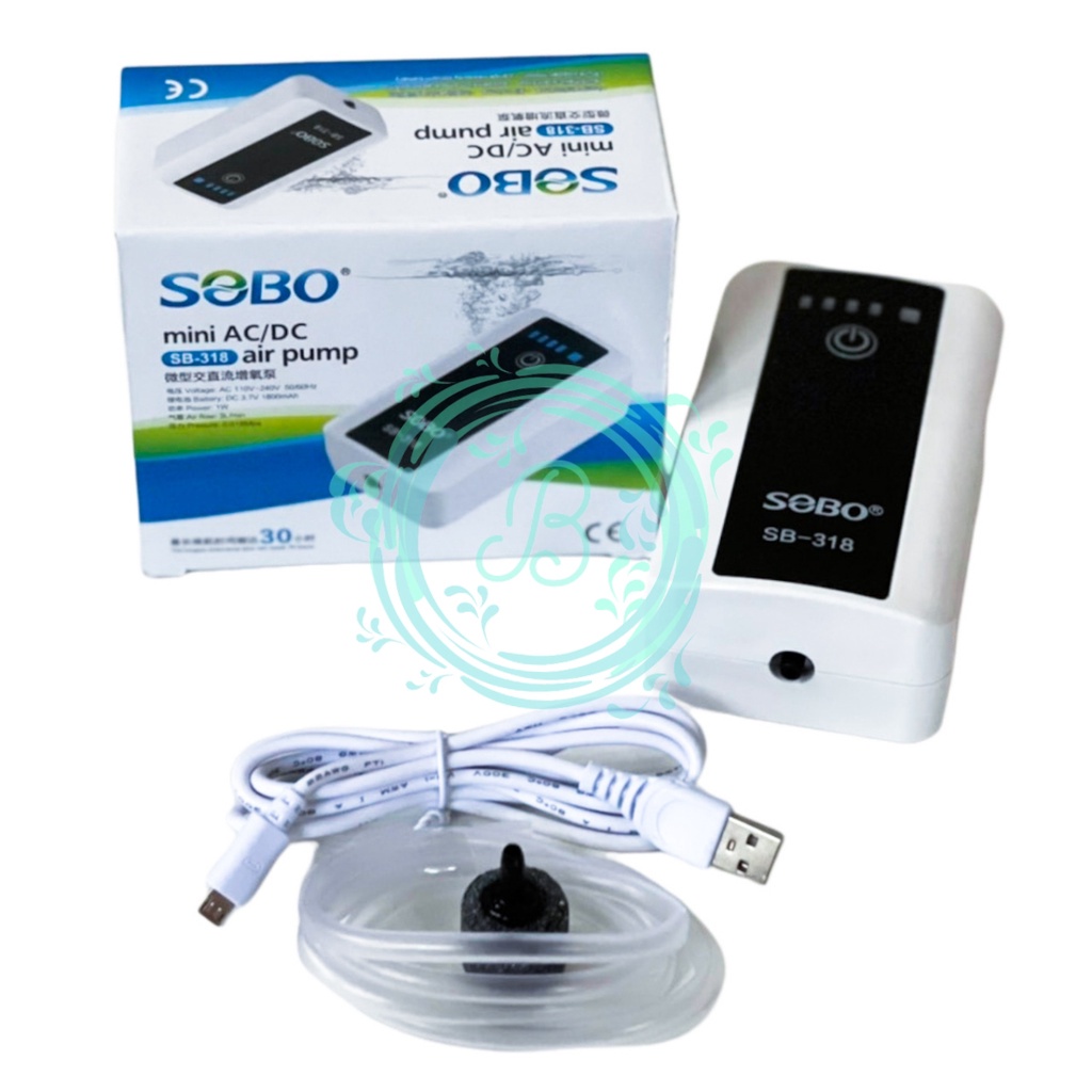 SOBO SB 318 Mini AC/DC Power : 1 Watt Voltase : 110V - 240V Frekuensi : 50/60 Hz Output : 3L/Min Pressure : 0.018 Mpa Battery : DC 3,7V 1800 mAh