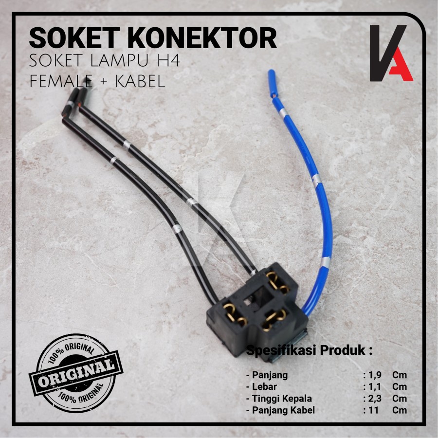 Spesifikasi Produk : Produk : Socket H4 Tipe Cewek Material Socket : Fiber Material Kabel : Serabut Tembaga Murni Panjang Kabel : 11 Cm Fungsi : Socket Lampu H4 Mobil