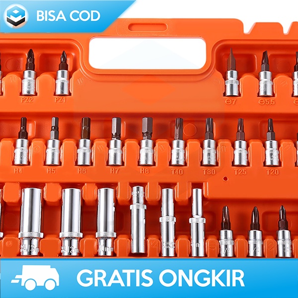 21 x Bit Socket PH1, PH2, PH3, PZ1, PZ2, PZ3, H3, H4, H5, H6, H7, H8, SL4, SL5.5, SL7, T10, T15, T20, T25, T30, T40 13 x 1/4: DR Sockets 4, 4.5, 5, 5.5, 6, 7, 8, 9, 10, 11, 12, 13, 14mm 3 x Hex Key Wrenches 1.5, 2.0, 2.5mm 1 x 1/4" DR Universal Joint 1 x 1/4" X2" Extension Bar 1 x 1/4" X4" Extension Bar 1 x 1/4" X6" Flexible Extension 1 x 1/4" Dr Sliding T Bar 1 x 1/4" Quick Ratchet Handle 1 x 6" Spinner Handle 1 x Bit Adaptor 1 x Blow Case 7 x 1/4" DR Deep Sockets 6, 7, 8, 10, 12, 13, 14mm Spesifikasi Material Chrome Vanadium Dimension Dimensi Box: 27 x 20 x 5 cm