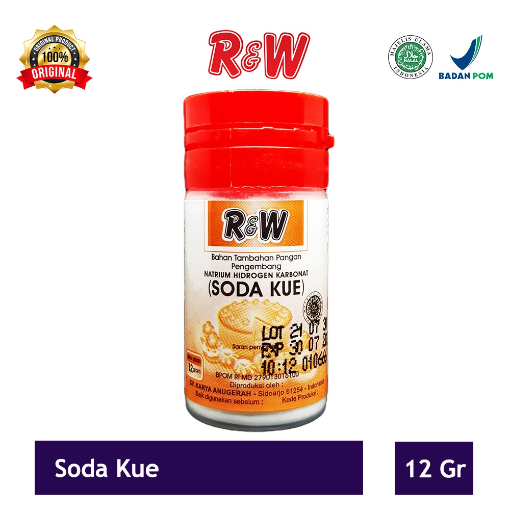 Soda Kue Rajawali R&W 12 g : Kegunaan : Sebagai pengembang karena mengeluarkan gelembung gas saat adonan kue dikukus, digoreng atau dipanggang. Umumnya ditambahkan untuk memperbaiki tekstur cake sehingga menjadi lebih berpori-pori dan kue kering menjadi lebih garing, kering dan renyah.
