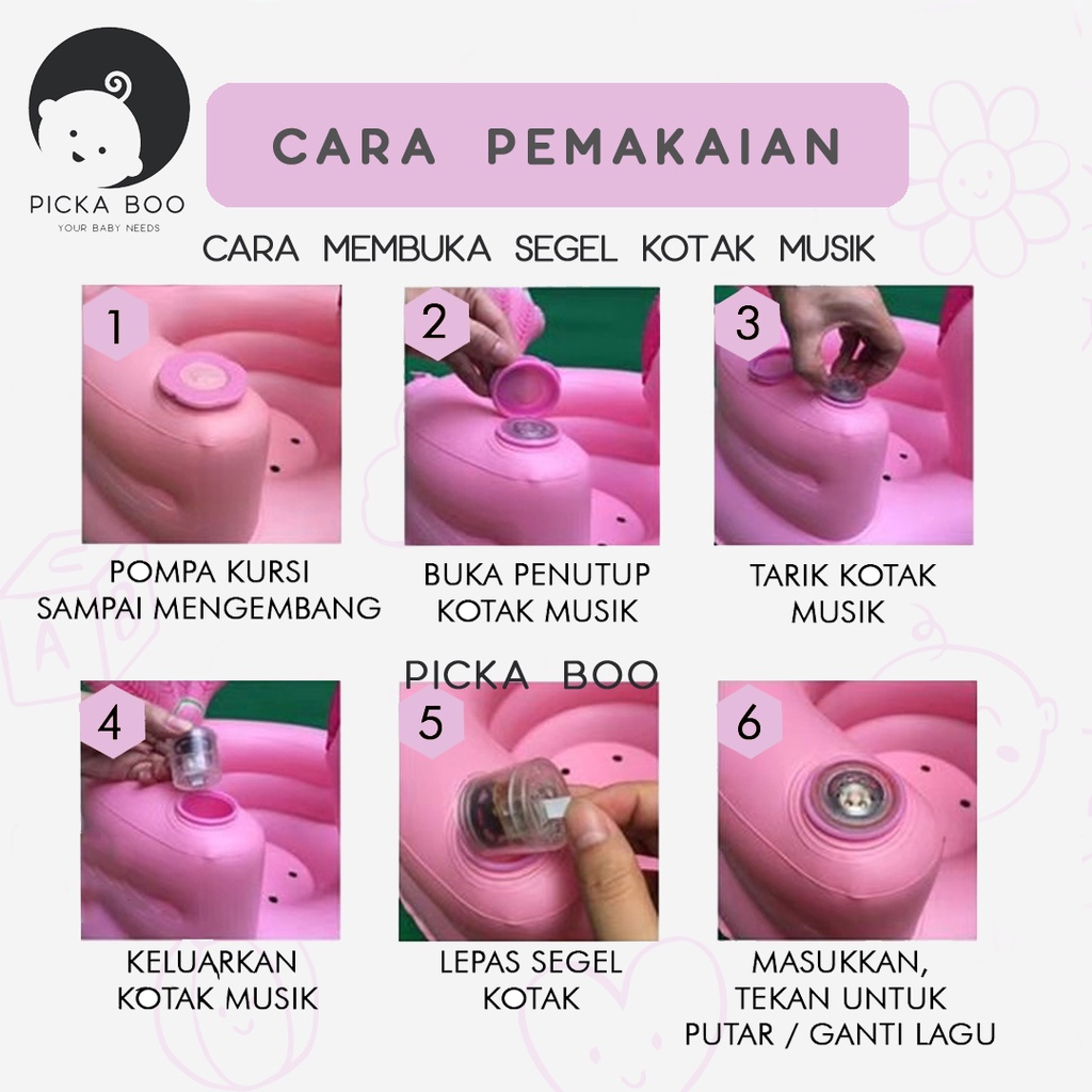 DESKRIPSI: ๐ Mudah untuk dipompa serta bisa dikemas ulang ๐ Ada musik, tinggal tekan saja. Cara menyalakan musik bisa GAMBAR PRODUK kami ya. GESER SLIDE GAMBAR KE KANAN :) ๐ Cocok dan praktis saat dibawa travelling ๐ Terdapat lubang drainase di bagian dudukan, berfungsi sebagai sirkulasi angin untuk kenyamanan bayi (tidak panas saat diduduki lama) dan aman digunakan saat mandi ๐ Aman digunakan buah hati, karena tidak terbuat dari material yang tajam ๐ Terdapat sandaran yang berfungsi sebagai pengaman pada bagian depan dan belakang, menjaga buah hati tidak terjungkal ๐ Musik menggunakan bahasa china ๐ Berat 550 gr, 1kg muat 2pcs